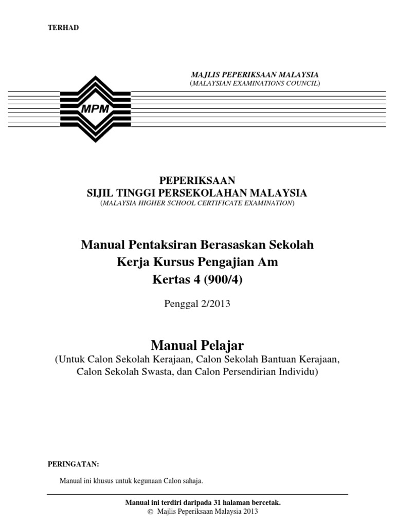 Encik mohd fakhruddin bin mohd subari. Apr 16, 2021 · 900 pengajian am archive 900 pengajian am files bahan kerja kursus 900/4 2021. Setiap calon sijil tinggi persekolahan malaysia (stpm) sekolah kerajaan, sekolah bantuan kerajaan, sekolah swasta, dan calon persendirian individu wajib melaksanakan kerja kursus sebagai satu daripada komponen penilaian untuk semester 2. Manual ini khusus untuk kegunaan guru, pemeriksa, dan calon sahaja. Manual pelaksanaan kerja kursus 9004 stpm.